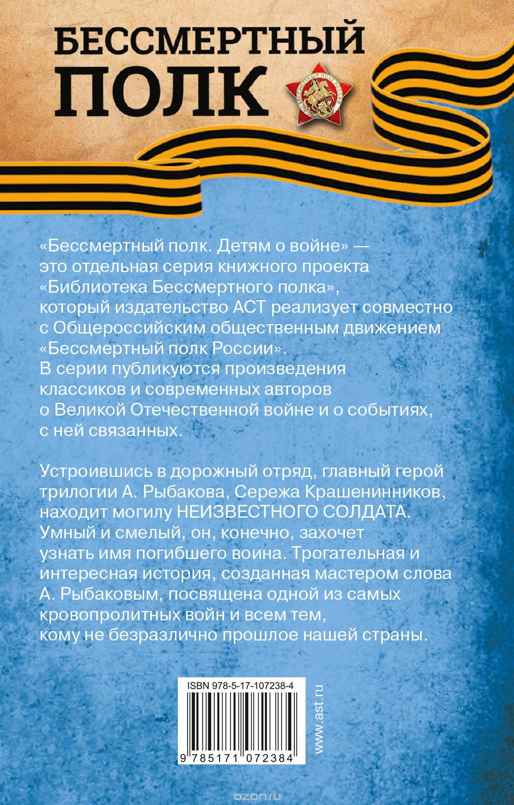 «Бессмертный полк. Детям о войне» – это отдельная серия книжного проекта «Библиотека Бессмертного полка», который издательство АСТ реализует совместно с Общероссийским движением «Бессмертный полк России». В серии публикуются произведения классиков и современных авторов о Великой Отечественной войне и о событиях, с ней связанных. Устроившись в дорожный отряд, главный герой трилогии А, Рыбакова, Серёжа Крашенинников, находит могилу НЕИЗВЕСТНОГО СОЛДАТА. Усный и смелый, он, конечно, захочет узнать имя погибшего воина. Трогательная и интересная история, созданная мастером слова А. Рыбаковым, посвящена одной из самых кровопролитных войн и всем тем, кому не безразлично прошлое нашей страны.